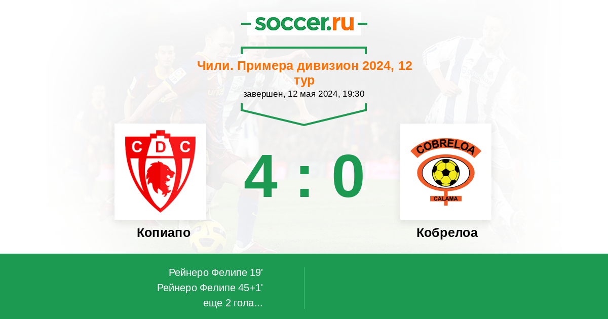 19' (1:0) Рейнеро Фелипе (11) (Кинтерос Максимилиано (29))