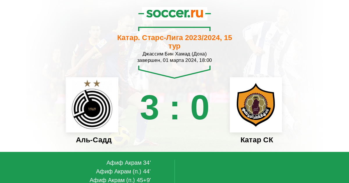 34' (1:0) Афиф Акрам (51) (Плата Гонсало (19))