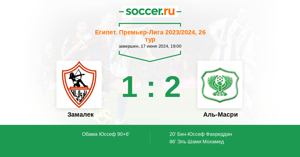 90+6' (1:2) Обама Юссеф (14) (Абдалла Сайед (18))