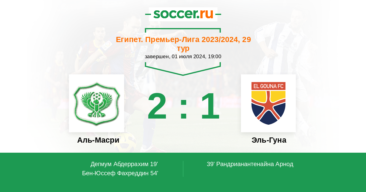 Запасные: 18 Джатта Алиу (с 46'), 90 Мазен Ясер (с 60'), 19 Магди Ашраф (с 60'), 9 Ганем Хоссам (с 67'), 40 Самир Хасан (с 82'), 15 Махмуд Окша, 16 Эль Хатаб Хасан, 25 Шета Абдельфаттах, 17 Эль Дегеми Мохамед