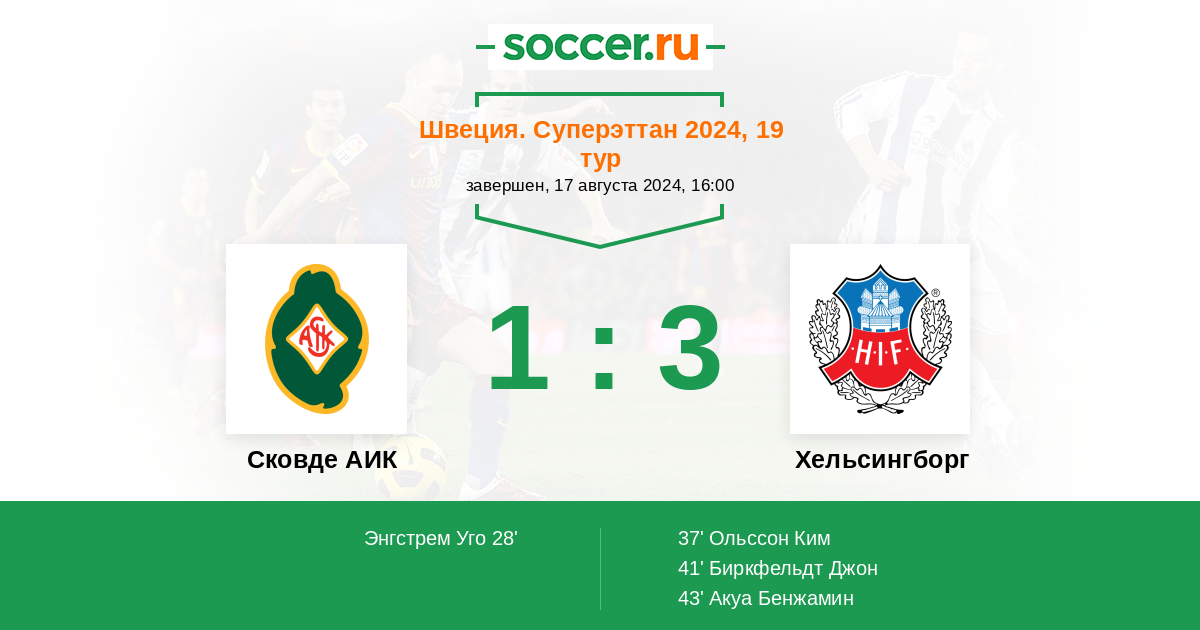 41' (1:2) Биркфельдт Джон (2) (Ольссон Ким (20))
