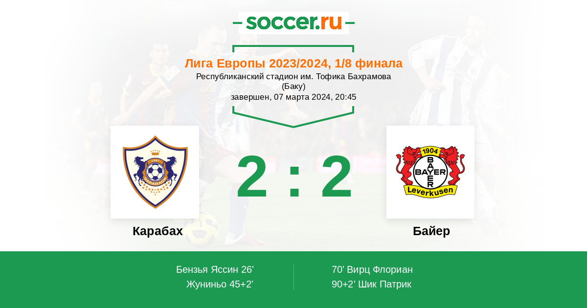 Запасные: 30 Фримпонг Джереми (с 46'), 10 Вирц Флориан (с 58'), 34 Джака Гранит (с 58'), 14 Шик Патрик (с 80'), 2 Станишич Йосип (с 81'), 32 Пуэрта Густаво, 1 Градецки Лукаш, 3 Инкапье Пьеро, 36 Ломб Никлас, 7 Хофманн Йонас