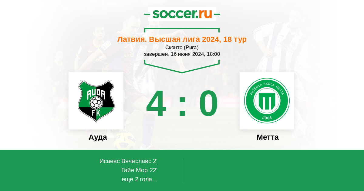 2' (1:0) Исаевс Вячеславс (26) (Клементе Матеус (7))