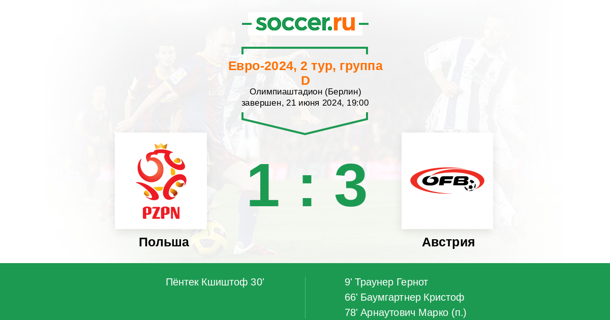 Польша - Австрия ! Командам желательно побеждать в этом матче , ведь поражение практически " поставить крест " на проигравшем . Поэтому команды будут играть на победу, но как это часто бывает - случается ничья . Х .