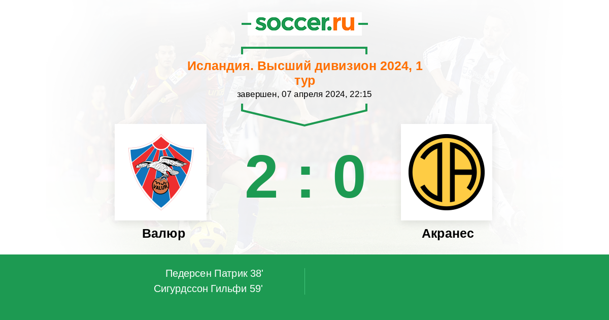 38' (1:0) Педерсен Патрик (9) (Омарссон Орри (20))