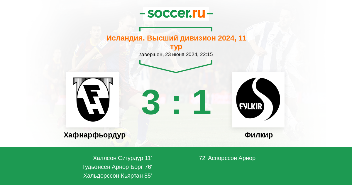 11' (1:0) Халлсон Сигурдур (9) (Бьорнссон Улфур (33))