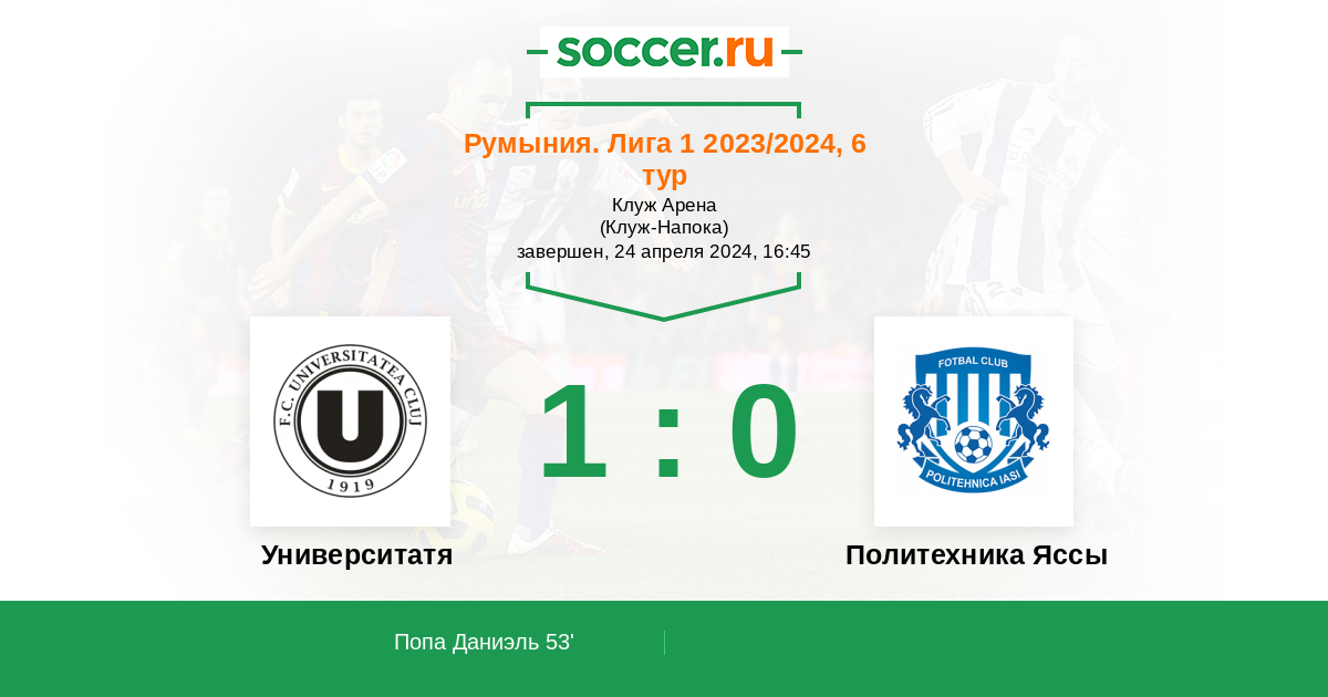 53' (1:0) Попа Даниэль (19) (Сигали Роберт (96))