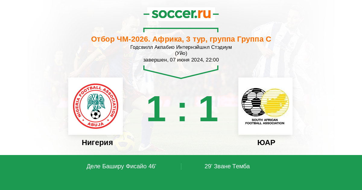 46' (1:1) Деле Баширу Фисайо (10) (Ивоби Алекс (17))