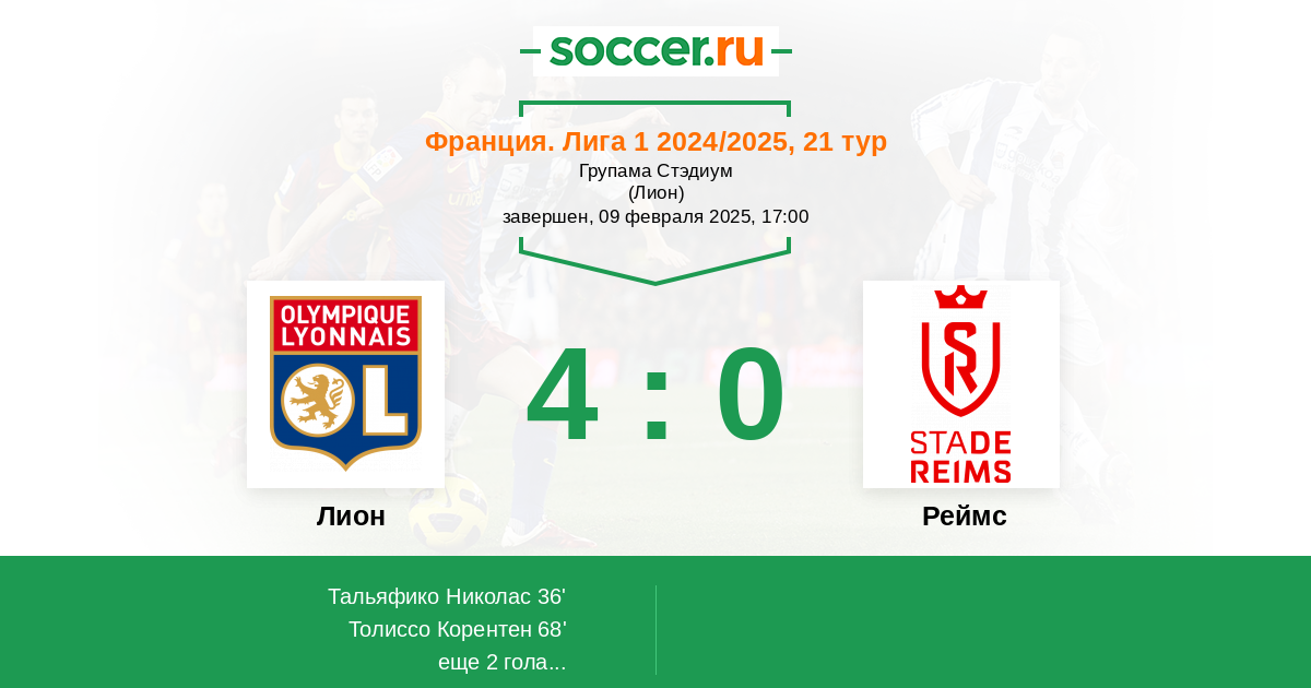 36' (1:0) Тальяфико Николас (3) (Толиссо Корентен (8))