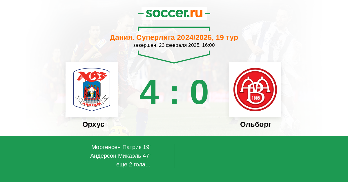 19' (1:0) Мортенсен Патрик (9) (Андерсон Микаэль (8))