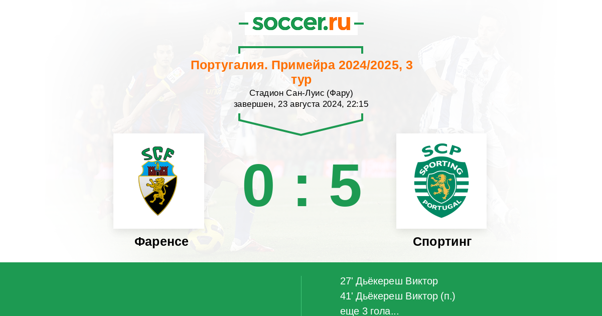 Вопреки некоторым проблемам в обороне и не до конца сформированному составу, усомниться в своём превосходстве чемпион пока не позволял. На сей раз "Спортингу" предстоит не самый простой вызов ― "Фаренсе" очевидно выше классом, нежели предыдущие противники, да и в прошлом сезоне в гостях обыграть его удалось с большим трудом. И всё же хозяева нынче совсем не радуют. Они потерпели два поражения, оборона барахлит, а нападение не справляется. Лиссабонцы вполне могут рассчитывать на очередной разгром.
