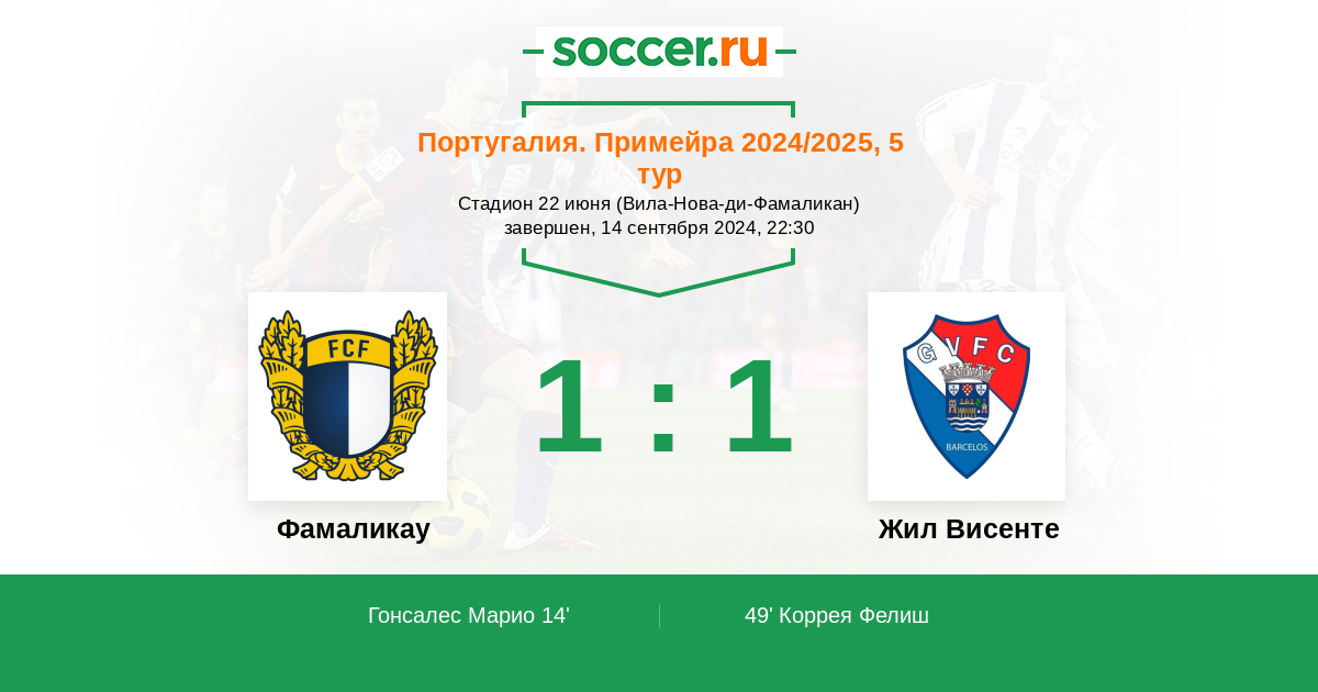 14' (1:0) Гонсалес Марио (9) (Маркос Винисиос (7))