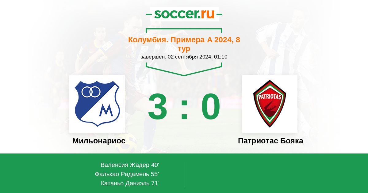 Запасные: 6 Диаз Хуан (с 57'), 9 Родригес Жоао (с 57'), 23 Белло Самуэль (с 58'), 2 Арче Хуан (с 77'), 13 Аристизабаль Хуан (с 77'), 1 Роман Серхио, 17 Чаррис Камило