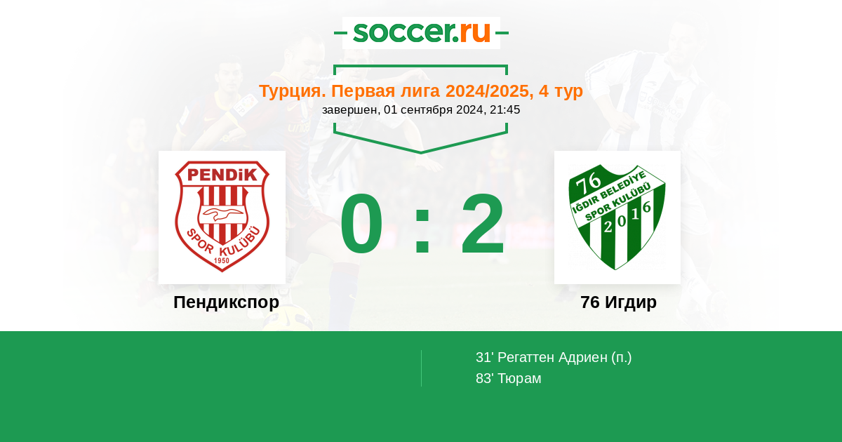 31' (0:1) Регаттен Адриен (10)