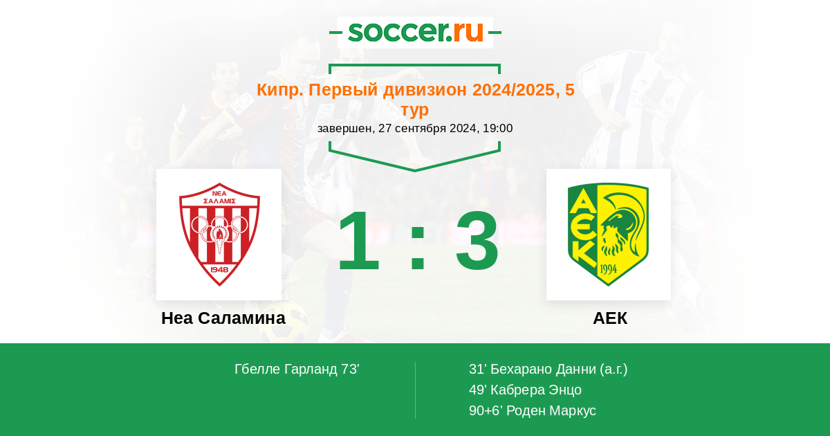 Запасные: 5 Микаэль Александрос (с 20'), 18 Карлитос (с 46'), 8 Тейшейра Мигель (с 53'), 12 Гбелле Гарланд (с 53'), 28 Бахасса Яссин (с 76'), 21 Спиридакис Димитриос, 23 Фрагкоу Андреас, 25 Прокопиу Титос, 33 Копторолос Саввас, 44 Викторос Гиоргос, 66 Компари Константинос, 98 Каланидес Янис