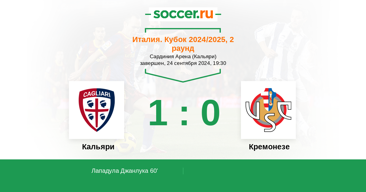 Кальяри по составу и по игре гораздо сильнее, чем Кремонезе. Они играют на своём поле, при своих болельщиках. Стартовый состав у обеих команд не будет основным, но отбывать номер он не будет.. Мы увидим борьбу. Счёт 1:0