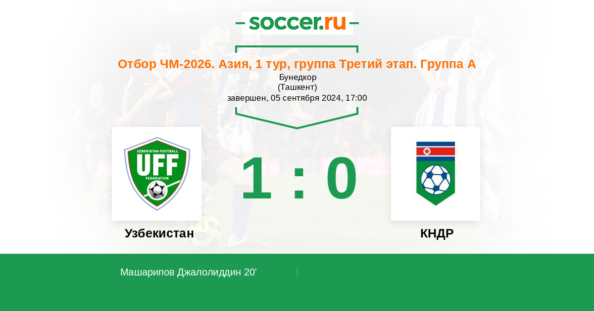 20' (1:0) Машарипов Джалолиддин (10) (Насруллайев Шезрод (13))
