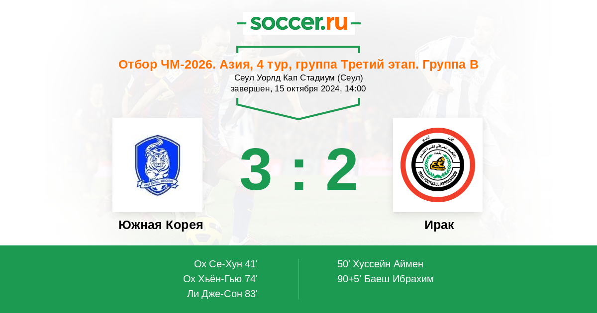 Запасные: 23 Ох Хьён-Гью (с 59'), 11 Мун Сон-Мин (с 59'), 7 Хон Хьен-Сук (с 85'), 5 Паик Сеунг-Хо (с 85'), 20 Ли Сын-Ву (с 87'), 1 Ким Сюн-Ю, 2 Мюн Ки Хван, 15 Чон Сын-Хен, 9 Чжу Мин-Кю, 12 Ким Джун-Хон, 13 Ли Дон-Жи, 16 Ким Чжун-Сан