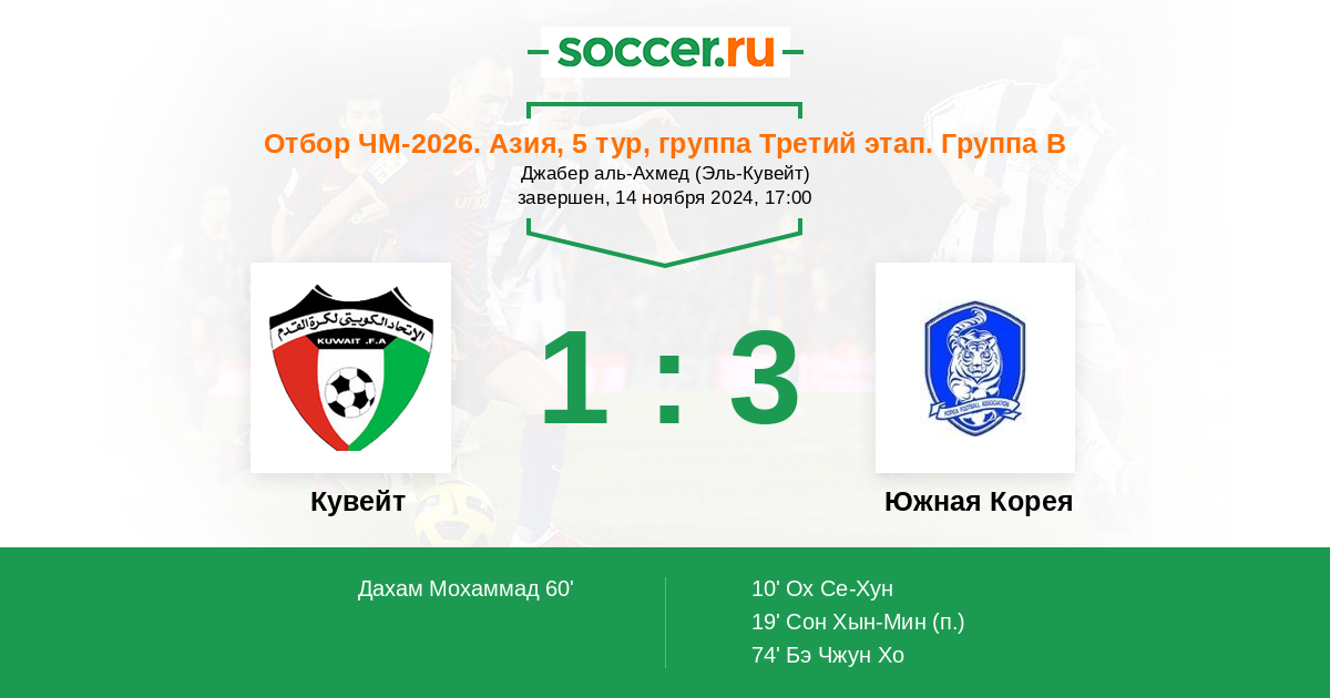 74' (1:3) Бэ Чжун Хо (17) (Хван Ин Бом (6))