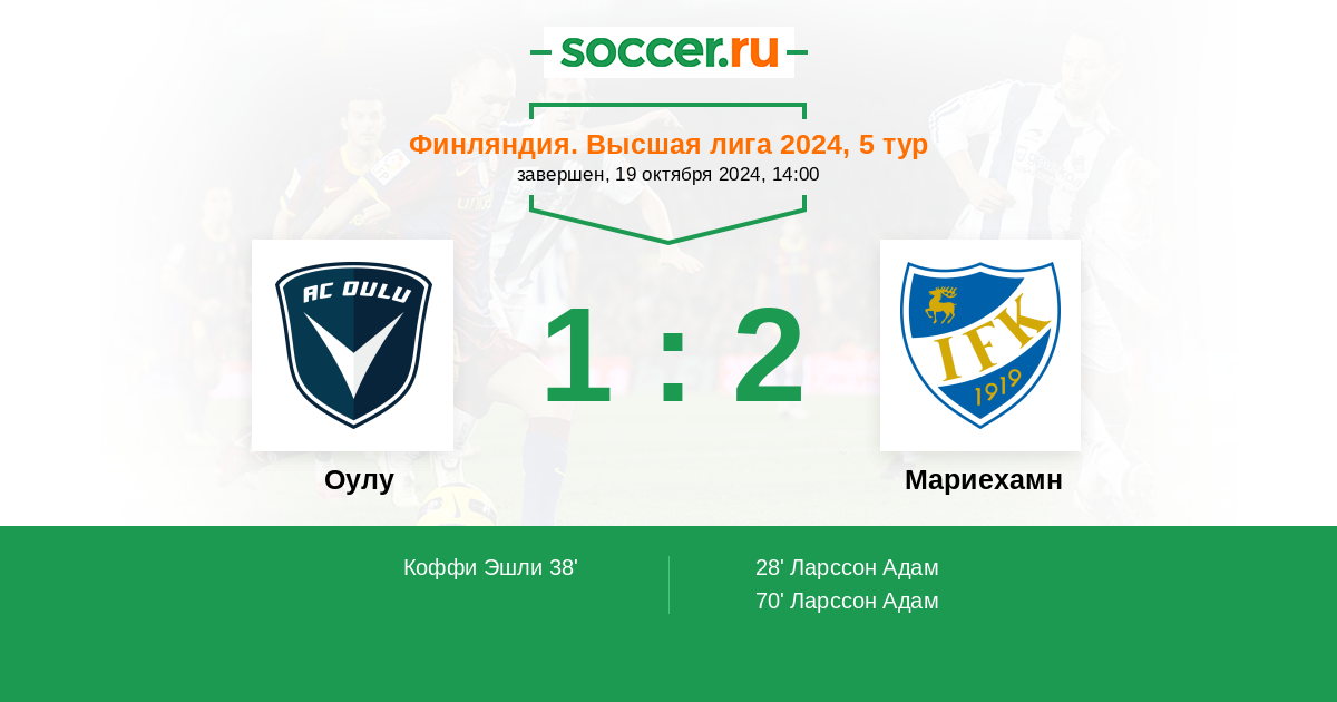 70' (1:2) Ларссон Адам (7) (Ниссинен Иржи (28))