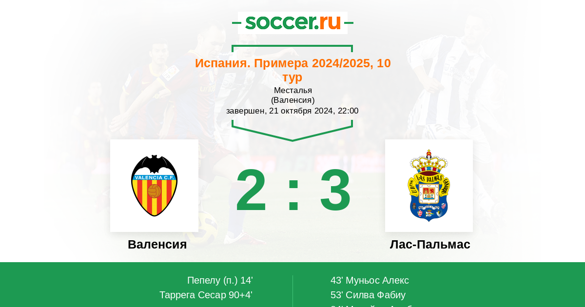 Валенсия - Лас-Пальмас ! Встречаются два " гиганта " Примеры в этом году . И если к гостям отношение в этом плане спокойное . Деградация хозяев удручает . и всё же надеюсь хоть на какой то "всплеск " с их стороны дома .