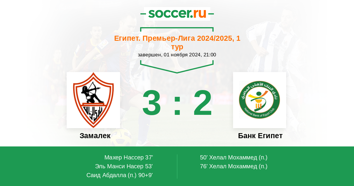 53' (2:1) Эль Манси Насер (9) (Махер Нассер (22))