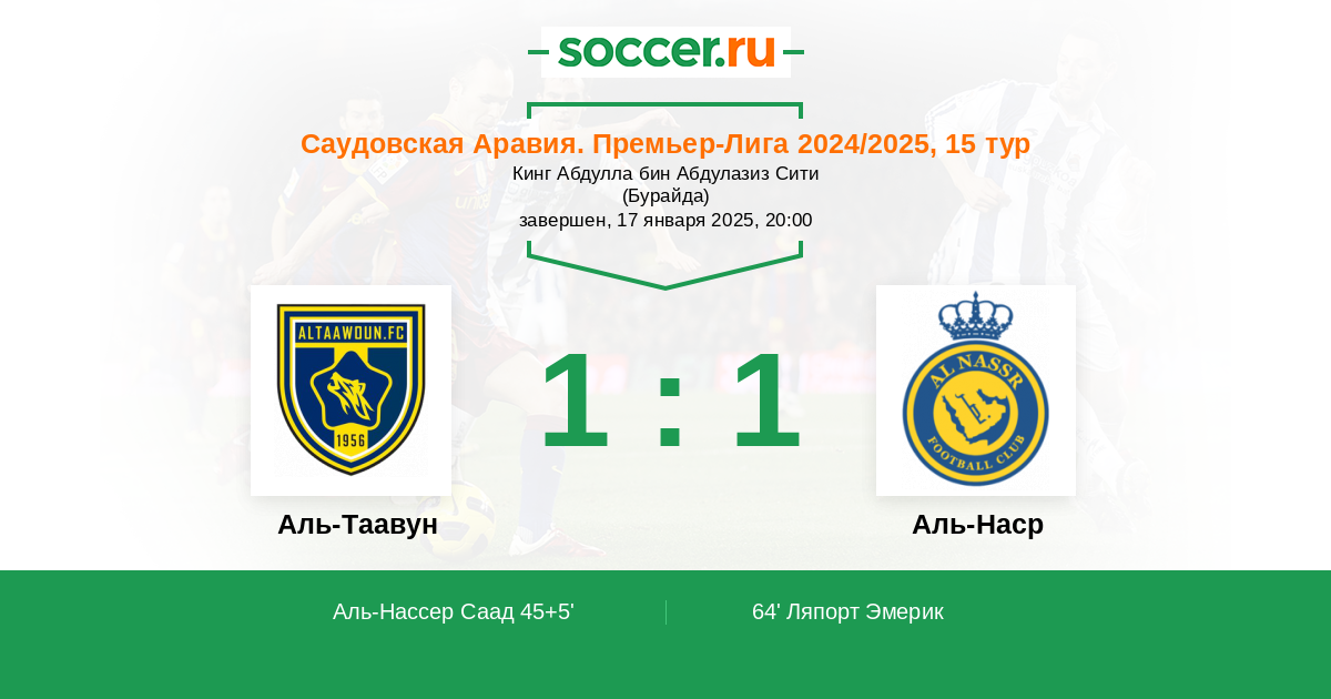 45+5' (1:0) Аль-Нассер Саад (8) (Аль-Джумайя Фахад (14))