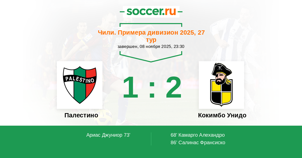 68' (0:1) Камарго Алехандро (8) (Палавесино Матиас (10))