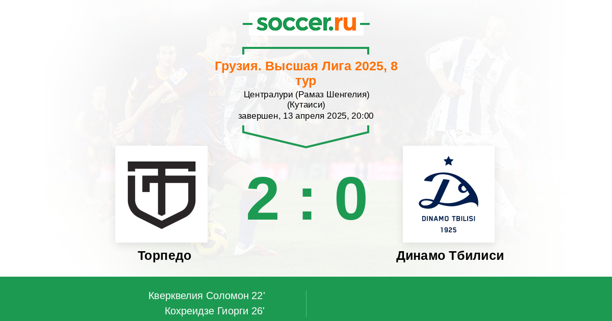 22' (1:0) Кверквелия Соломон (4) (Кохреидзе Гиорги (10))