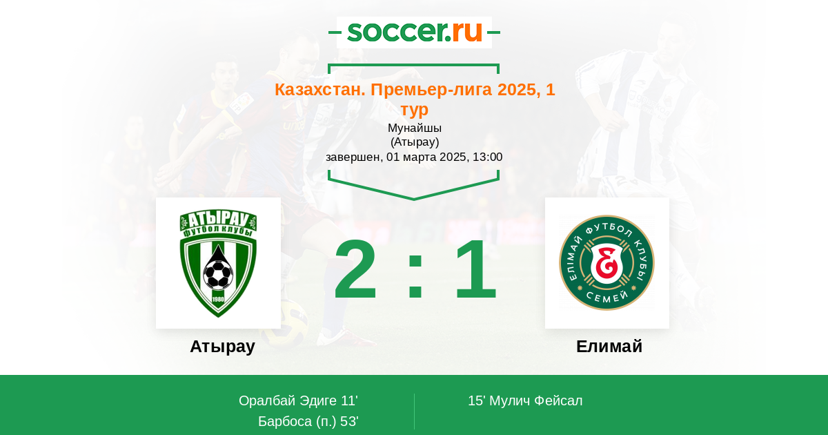 15' (1:1) Мулич Фейсал (9) (Мужиков Серикжан (28))