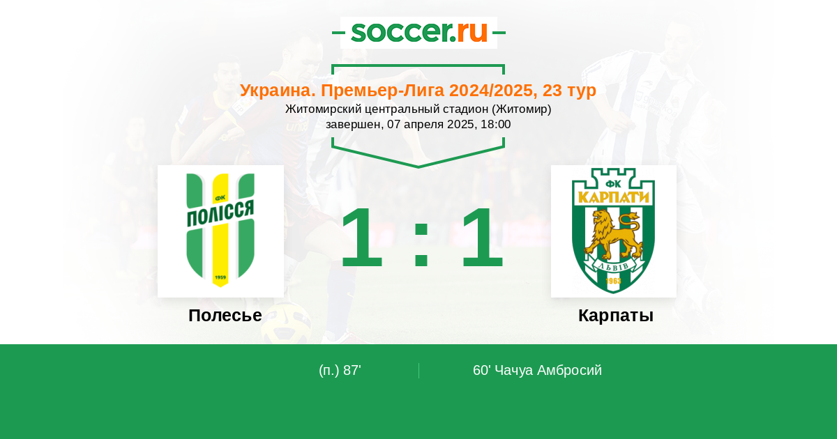 60' (0:1) Чачуа Амбросий (8) (Очеретко Олег (20))