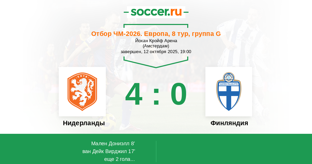 увидим открытый стиль игры и молниеносные контратаки оранжевых, которые так любят быстроногие фланговые футболисты голландской команды, особенно Дензел Думфрис и Джереми Фримпонг. Суоми не удастся избежать разгрома.