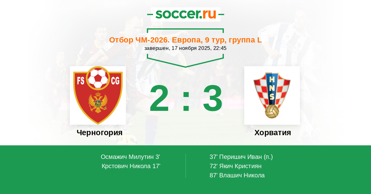 17' (2:0) Крстович Никола (9) (Йоветич Стеван (10))
