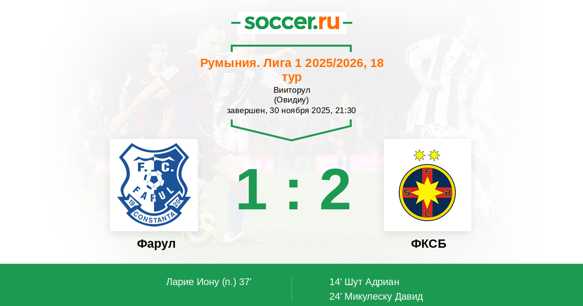 14' (0:1) Шут Адриан (8) (Олару Дариуш (27))