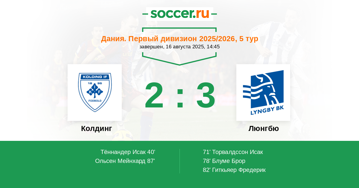 Запасные: 16 Мейер Йохан (с 88'), 26 Гиткьяер Фредерик (с 79'), 7 Колин Саймон (с 46'), 6 Блуме Брор (с 23'), 4 Ролланд Баптист, 17 Стейндорссон Уильям, 21 Олсен Оскар, 13 Винтер Каспер, 11 Варминг Магнус