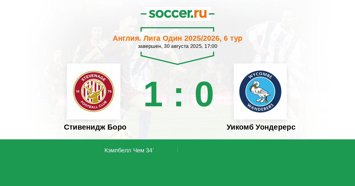 34' (1:0) Кэмпбелл Чем (20)