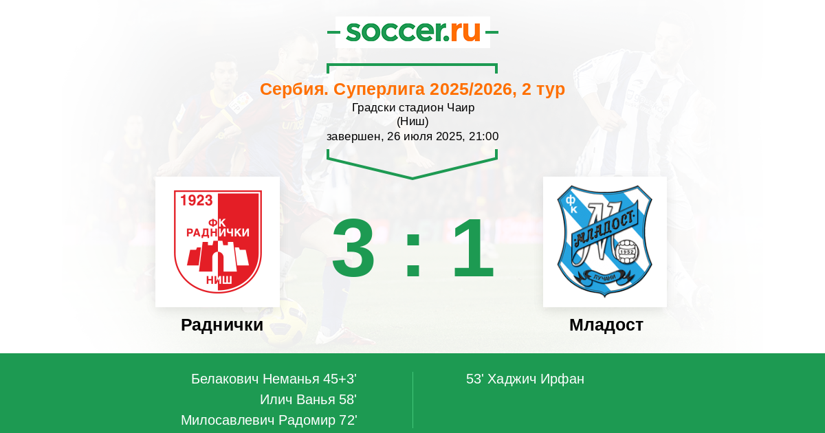 72' (3:1) Милосавлевич Радомир (22) (Шречкович Никола (20))