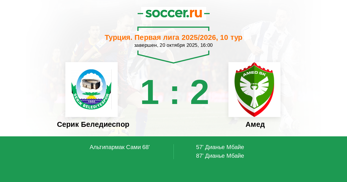 57' (0:1) Дианье Мбайе (45) (Али Калдырым Хасан (3))