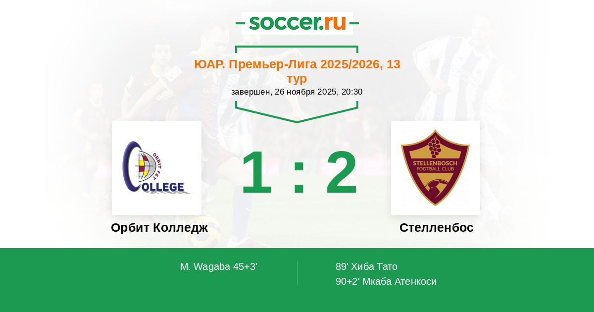 90+2' (1:2) Мкаба Атенкоси (26) (Купидо Эшли (9))