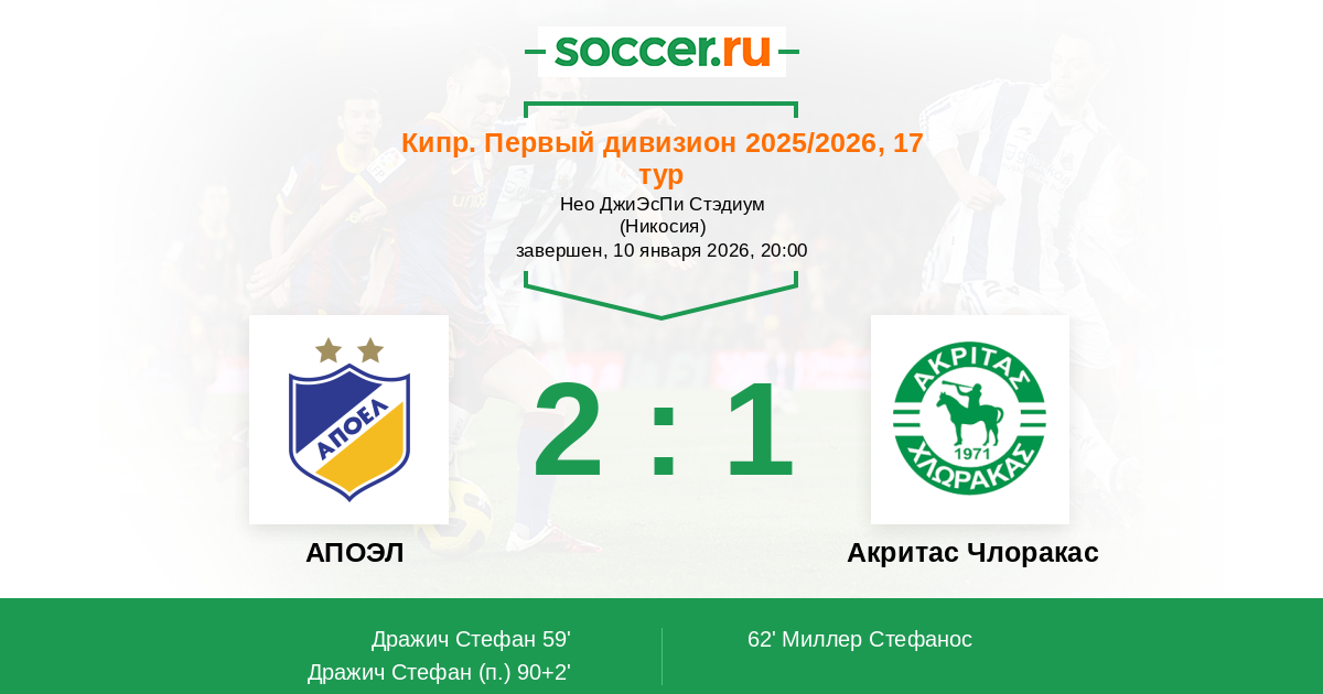 Запасные: 88 Теокли Андреас, 99 Бекер Игал, 3 Генетлиу Ламброс, 5 Антониу Кириакос (с 74'), 11 Атанасиу Андреас (с 74'), 22 Бенито, 24 Дубов Никита, 30 Василиу Гиоргос (с 74'), 80 Carlitos (с 60'), 82 Ананг Бенсон (с 90+5')