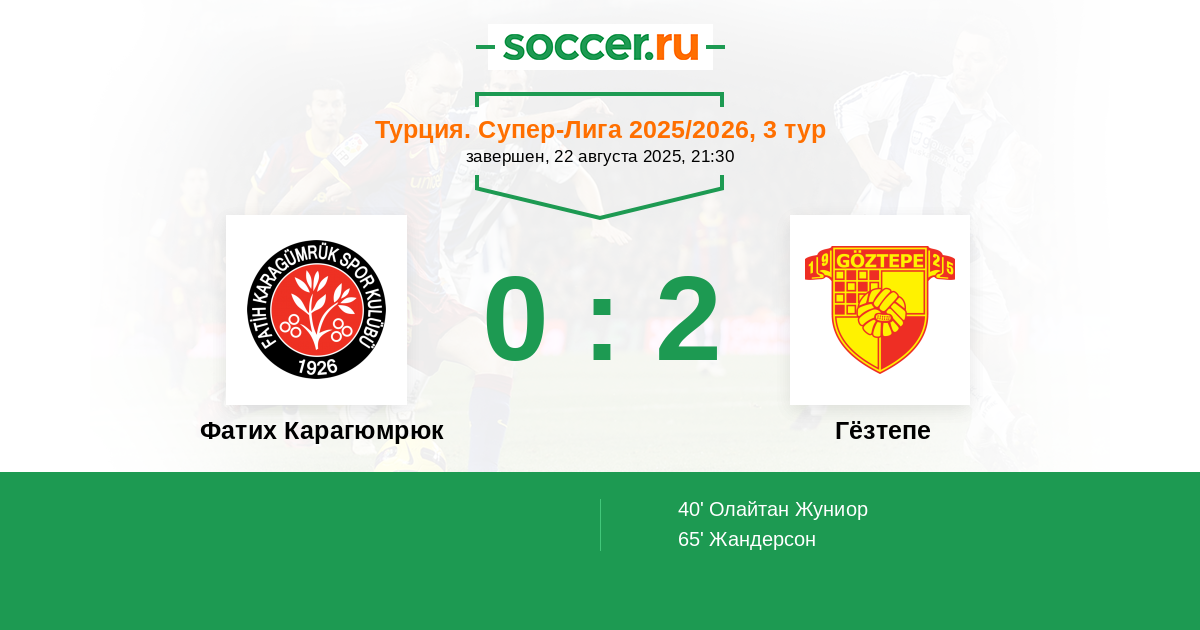 40' (0:1) Олайтан Жуниор (10) (Жандерсон (39))
