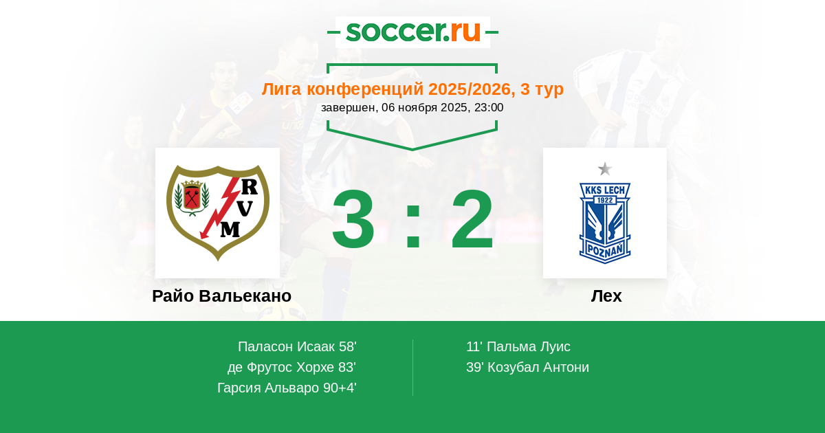Лех П второй по значению клуб Польши. Буква "П" означает, что он из города Познань. Прозвище Железнодорожники Лех, получил, скорее всего, потому, что город, по совместительству, является крупным ж/д узлом. Шансы? Они есть у всех - вон, вчера, Пафос в Лиге чемпионов уделал Вильярреал. Победа хозяев.