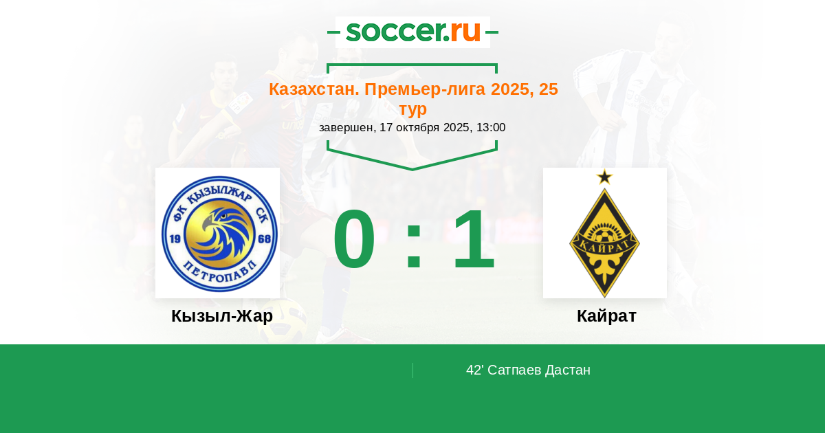 42' (0:1) Сатпаев Дастан (9) (Арад Офри (15))