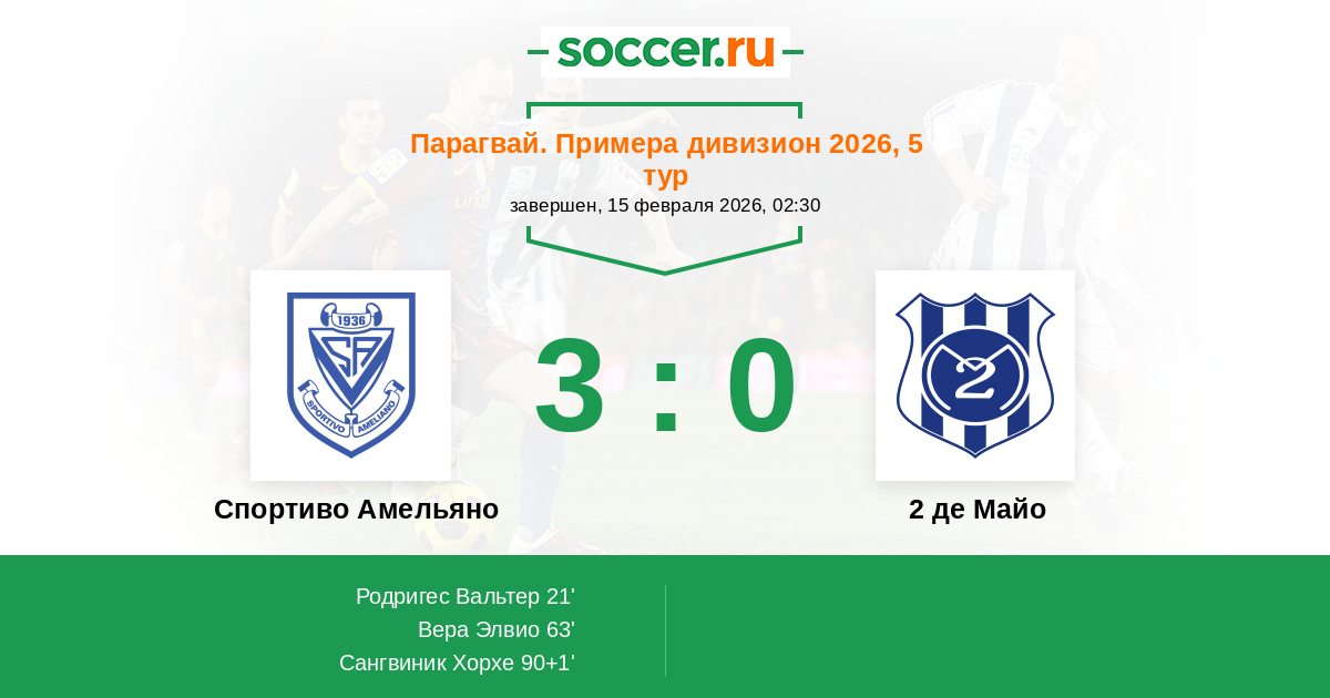 21' (1:0) Родригес Вальтер (15) (Вера Фреди (7))