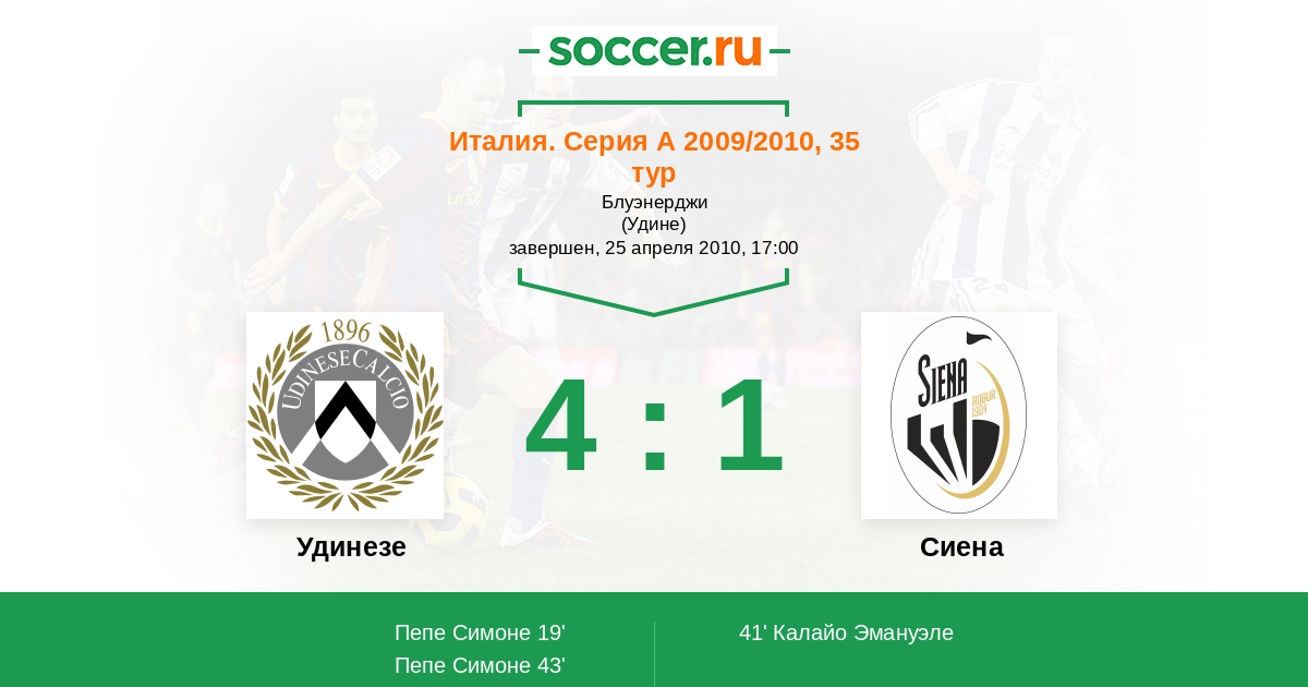 41' (1:1) Калайо Эмануэле (11) (Маккароне Массимо (32))