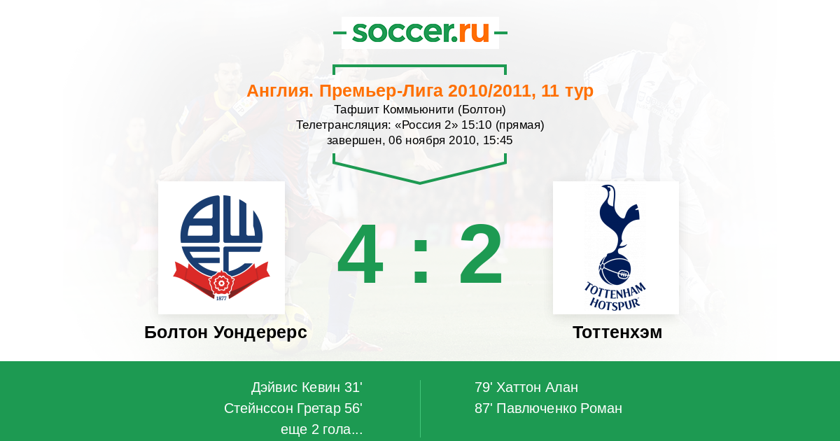 Запасные: 9 Павлюченко Роман (с 46'), 6 Хаддлстоун Том (с 62'), 5 Бентли Дэвид (с 78'), 23 Кудичини Карло, 8 Дженас Джермэйн, 19 Бассонг Себастьен, 22 Чорлука Ведран
