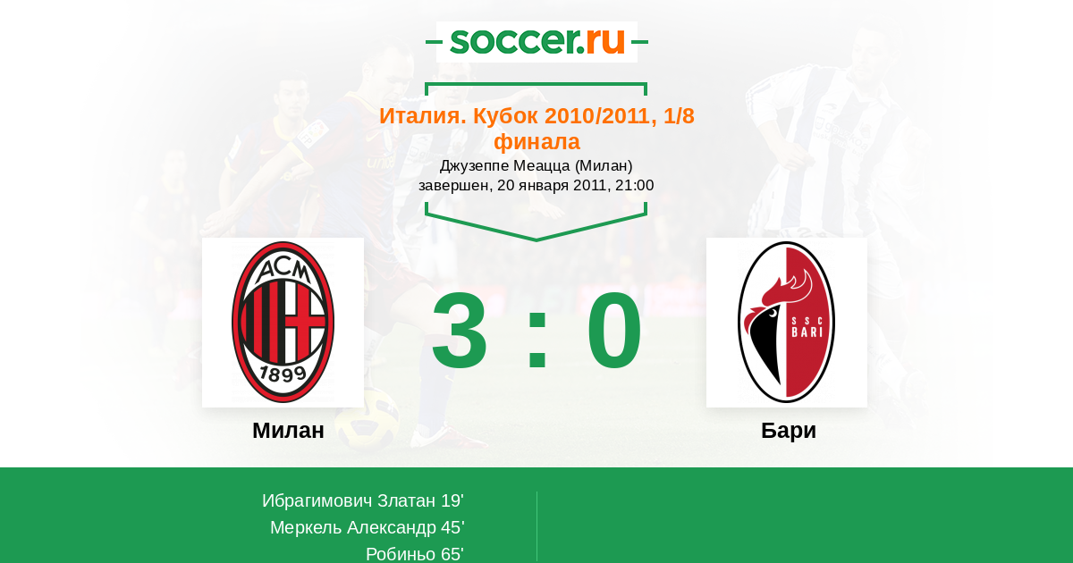 Запасные: Абате Иньяцио (с 46'), Пирло Андреа (с 66'), Пато (с 72'), Аббьяти Кристиан, Бонера Даниэле, Страссер Родни, Одуамади Ннамди
