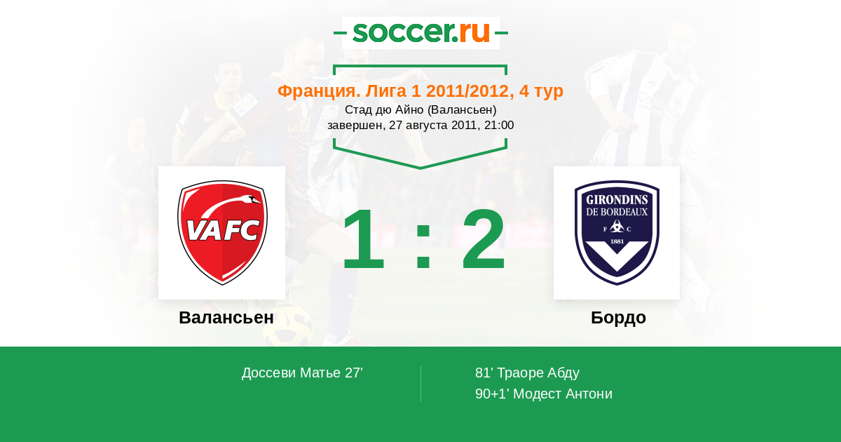 27' (1:0) Доссеви Матье (10) (Данич Гаэль (8))