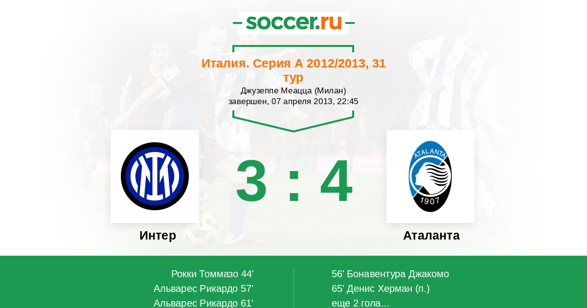 Запасные: 11 Альварес Рикардо (с 32'), 7 Скелотто Эсекьель (с 83'), 6 Сильвестре Матиас, 17 Кузманович Здравко, 24 Бенасси Марко, 27 Белец Вид, 28 Паса Стимоне, 30 Каррисо Хуан Пабло, 47 Коломби Маттео, 55 Нагатомо Юто, 45 Форте Франческо