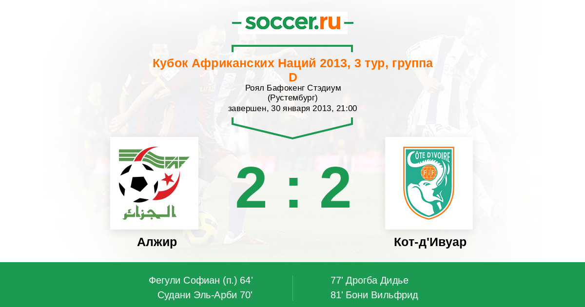 Запасные: 13 Конан Дидье Я (с 46'), 21 Эбуэ Эммануэль (с 85'), 5 Зокора Дидье (с 90+3'), 1 Барри Бубакар, 9 Тиоте Шейк, 10 Жервиньо, 15 Градель Макс, 17 Тьене Сиака, 18 Траоре Ласина, 19 Туре Яя, 22 Бамба Сулейман, 23 Сангаре Бадра